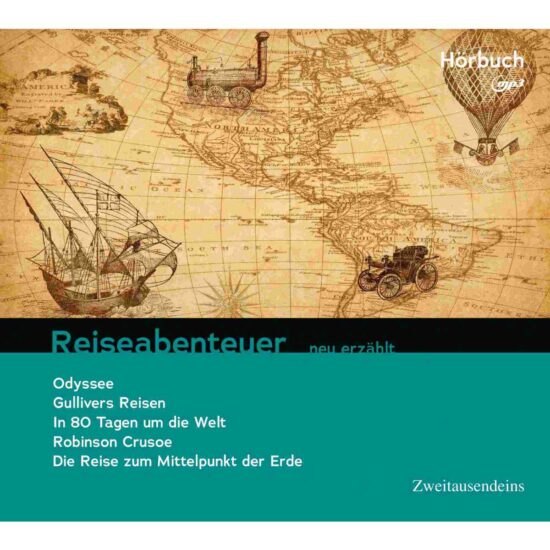 Reiseabenteuer. Fünf Klassiker der Weltliteratur für viele Stunden:Odyssee (Sprecher: E.A. Schepmann)Gullivers Reisen (Sprecher: Ilja Richter)In 80 Tagen um die Welt (Sprecher: Jürgen Thormann)Robinson Crusoe (Sprecher: Jürgen Thormann)Die Reise zum Mittelpunkt der Erde (Sprecher: Friedhelm Ptok).5 Hörbücher auf MP3-CD. Zweitausendeins.